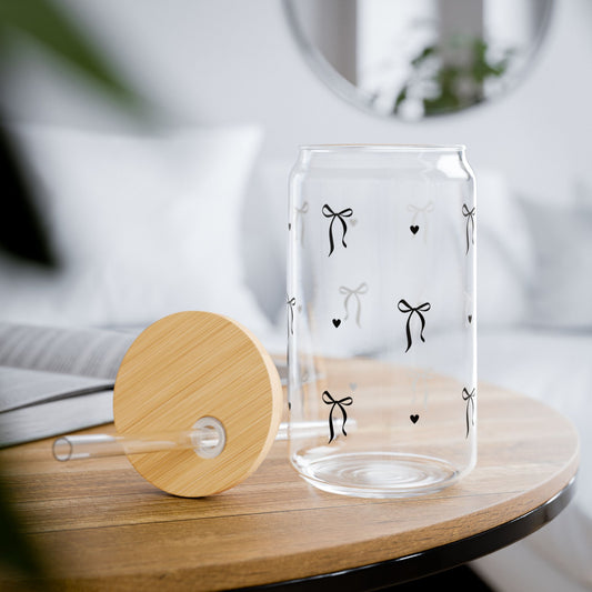 Glass Cup, 16oz Black Bow and Heart Pattern Sipper